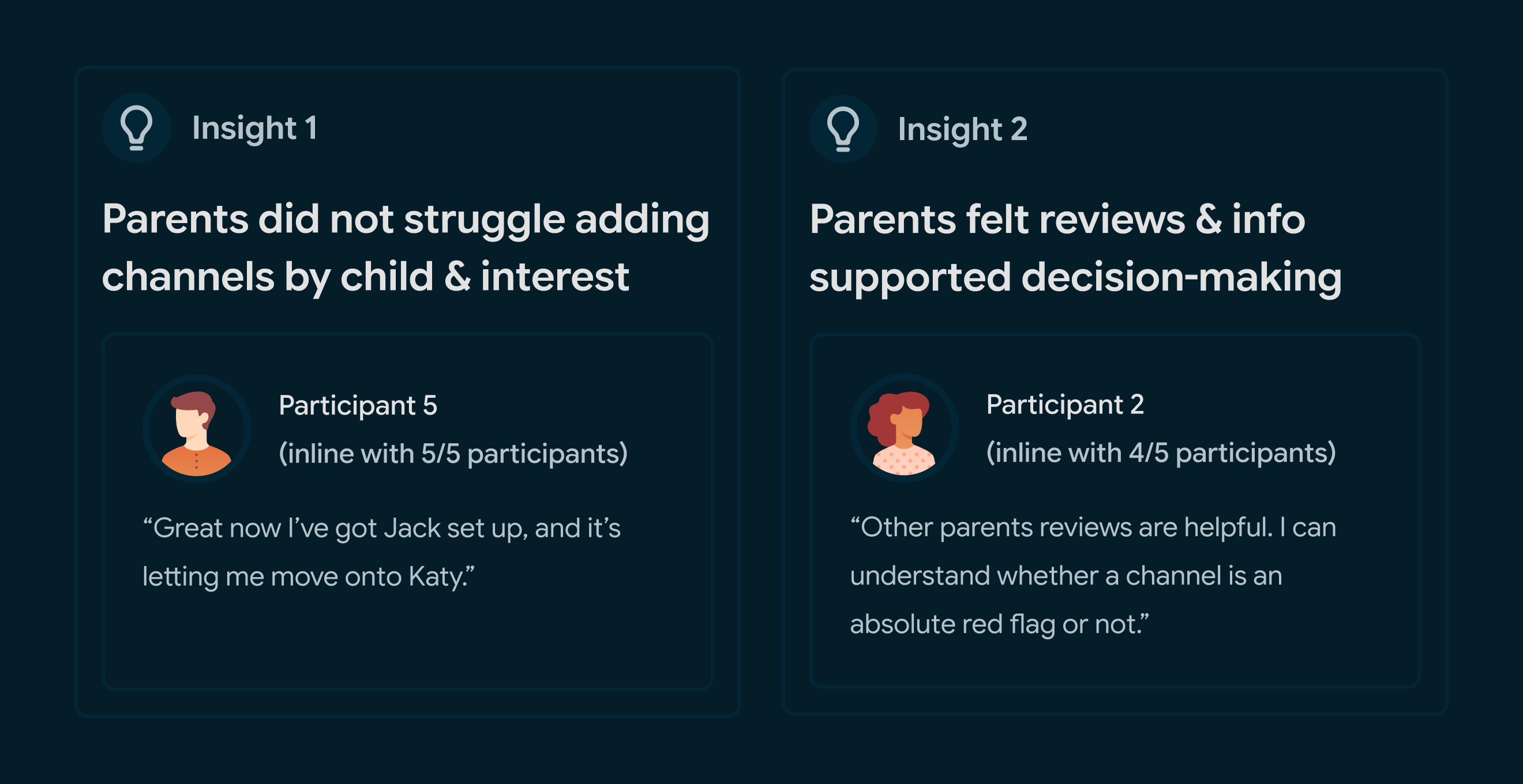I then integrated the updated user flow into a new prototype as the test stimulus and ran a second round of testing with a new set of five participants whose children regularly use YouTube or YouTube Kids.