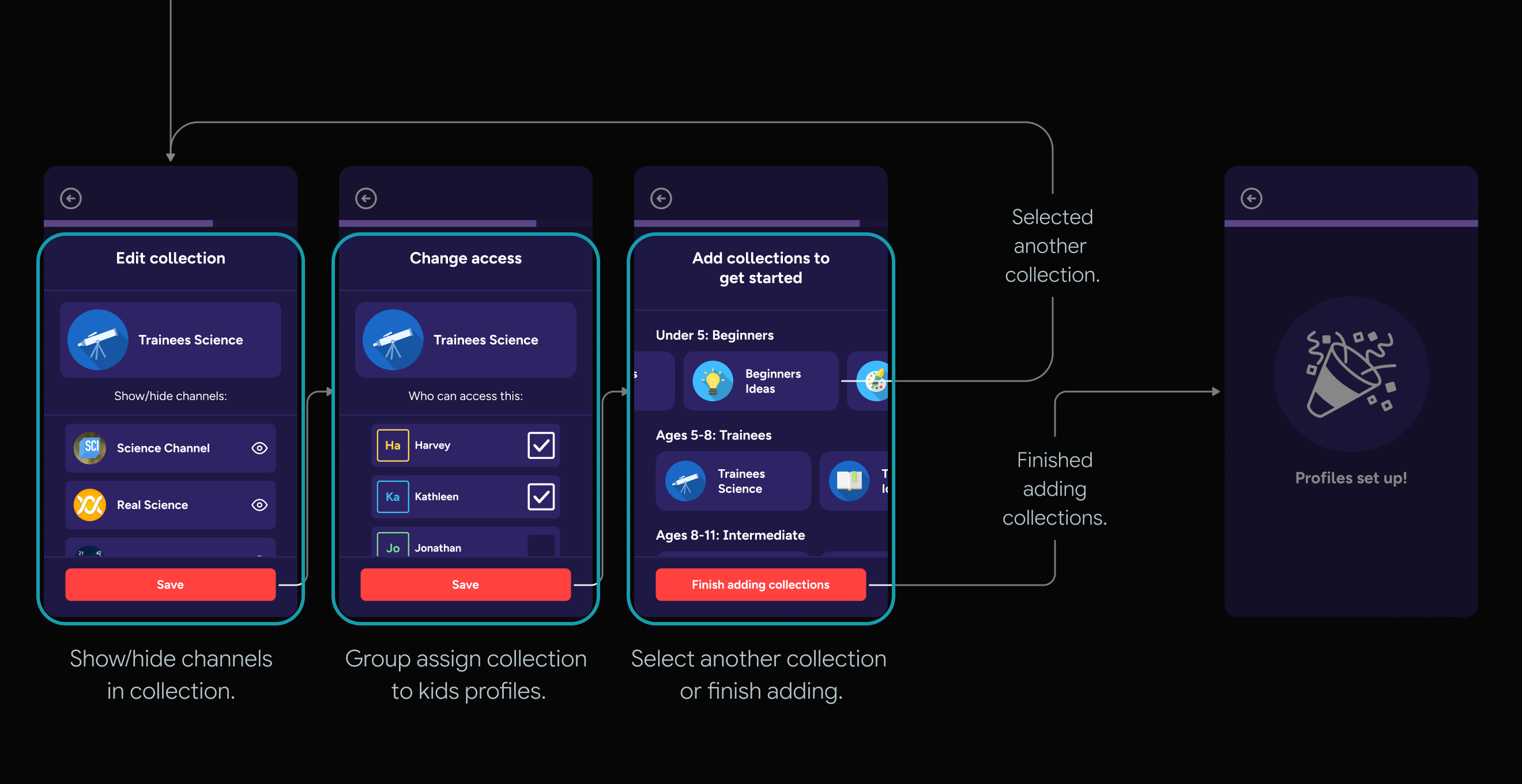 If parents can add curated, interest-based collections of YouTube channels (created by us) and assign them to individual children, they will find it easy to set up and manage multiple profiles and feel in control of their kids YouTube space.