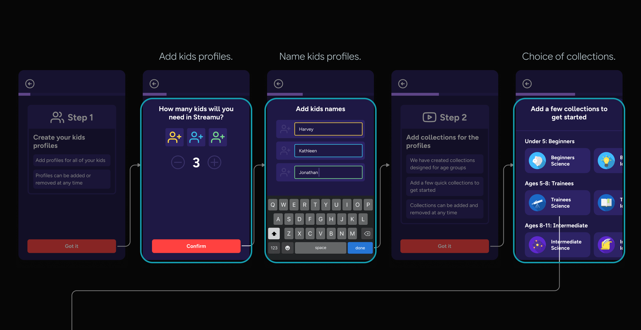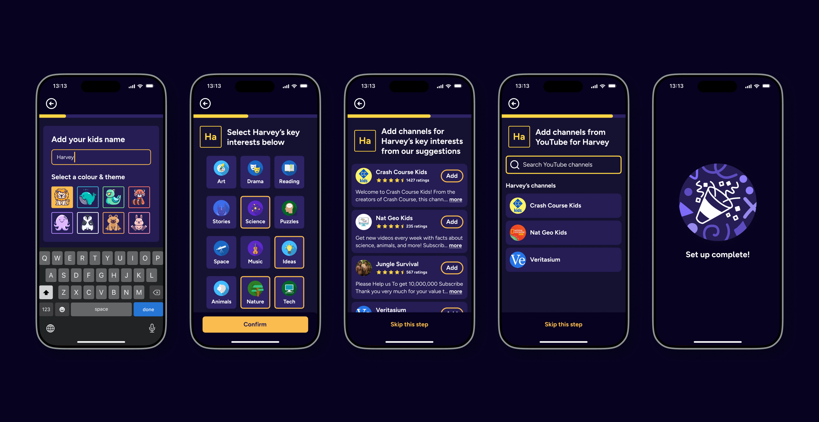 If parents select interests for each child, then add parent reviewed interest-based channels for each child separately, they will find the setup process more intuitive, better aligned with their mental models and feel more in control.